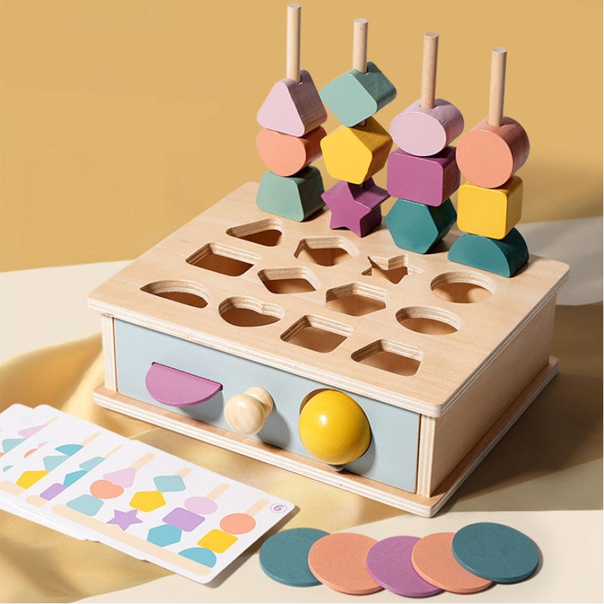 This educational toy combines two classic early childhood learning activities: geometric shape matching and a coin drawer, providing children with a diverse range of interactive experiences. One side of the toy features a shape matching area where children need to place different geometric shapes into the corresponding holes, developing shape recognition and spatial understanding through observation and experimentation. The other side features a coin drawer design, allowing children to insert and remove coins, experiencing the fun of manipulation while also gaining an initial understanding of numbers and counting concepts. Through repeated operation and exploration, children can develop hand-eye coordination and fine motor skills, while also improving logical thinking, concentration, and patience.