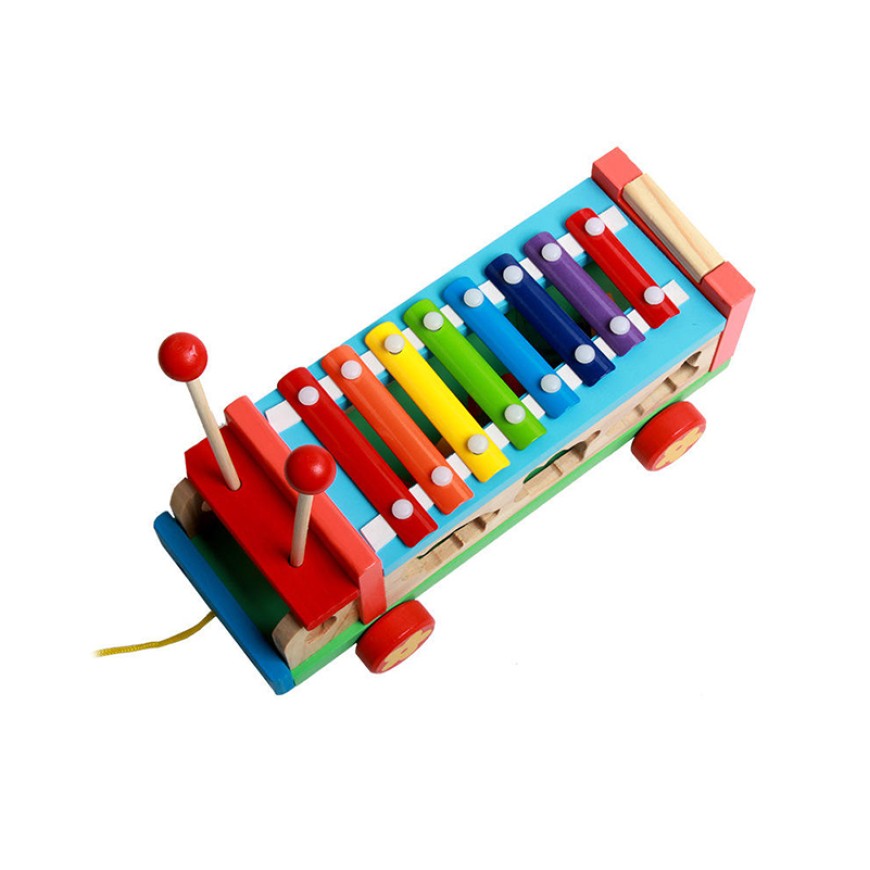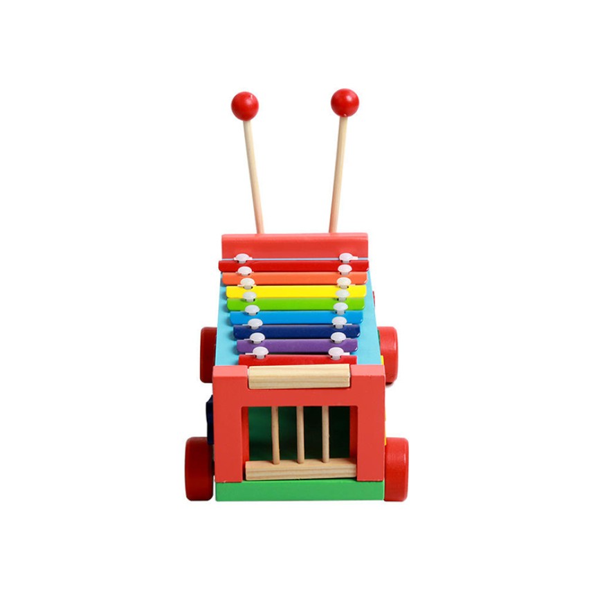 This baby musical toy is a wooden pull-along cart that cleverly combines a xylophone with shape-sorting functionality, designed specifically for early musical enlightenment and cognitive development in babies. The cart has a cute design, allowing babies to develop gross motor skills and balance while pushing and pulling it, and also stimulating their curiosity. The built-in xylophone produces clear and pleasant notes when gently tapped, helping babies perceive pitch and rhythm and fostering an interest in music. The shape-sorting design, through matching and placing different shapes, promotes babies' understanding of shapes and spatial relationships, improving hand-eye coordination and fine motor skills.