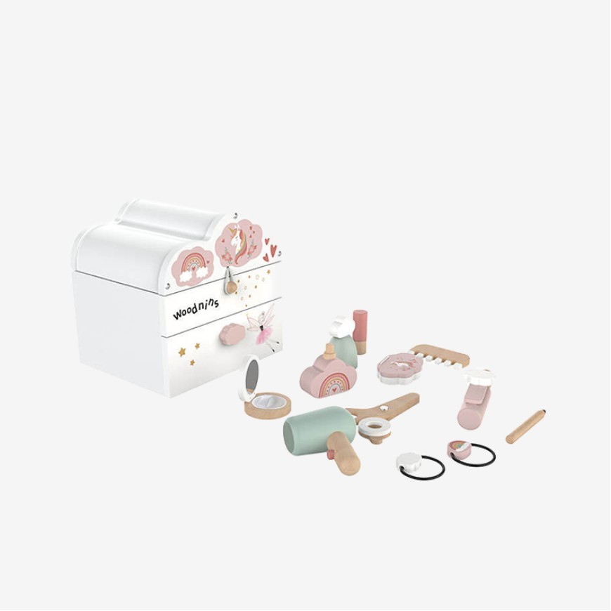 This wooden makeup box early education toy features a delicate and adorable design, including the makeup box itself, a mirror, a comb, and various makeup accessories.  It allows children to simulate the process of applying makeup and styling their hair through play. By arranging cosmetics, styling hair, and using the mirror, children can develop hand-eye coordination and fine motor skills, while also stimulating creativity and imagination. The toy encourages role-playing and interactive scenarios; children can simulate daily grooming routines, hold mini beauty shows, or engage in creative makeup games with friends, improving their language skills, social skills, and self-awareness through play.