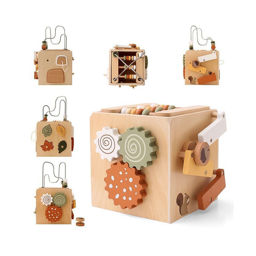This wooden busy box puzzle toy combines two classic early childhood education activities: geometric shape matching and abacus bead manipulation, providing children with a rich and diverse hands-on experience. One side of the busy box features a geometric shape matching area, where children need to observe and think to accurately place different shapes into their corresponding holes, gradually developing shape recognition and spatial understanding. The other side features an abacus with colorful beads, allowing children to move the beads to count and arrange them, introducing basic number concepts through play. Through repeated manipulation and experimentation, children can effectively develop hand-eye coordination and fine motor skills, while also cultivating concentration, patience, and problem-solving abilities.