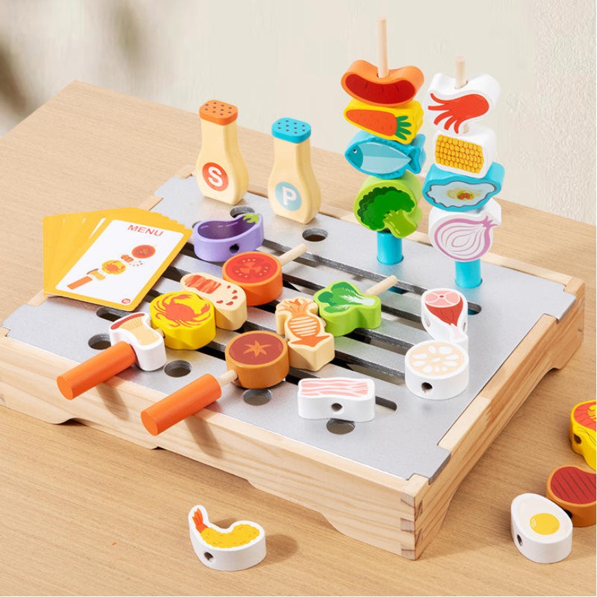 This wooden pretend play barbecue toy set features a fun barbecue scene design and includes a wooden barbecue grill, skewers, vegetable models, and tongs. Children can simulate grilling, plating, and cooking food while playing. By manipulating the barbecue tools and ingredients, children can develop hand-eye coordination and fine motor skills, while also stimulating creativity and imagination. The toy encourages role-playing and interactive scenarios, allowing children to pretend to be little chefs grilling or hosting a barbecue party, interacting and sharing with friends or parents. Through play, they can learn about food recognition, simple cooking steps, and the concept of sharing. Role-playing also enhances language skills, social skills, and cooperation.