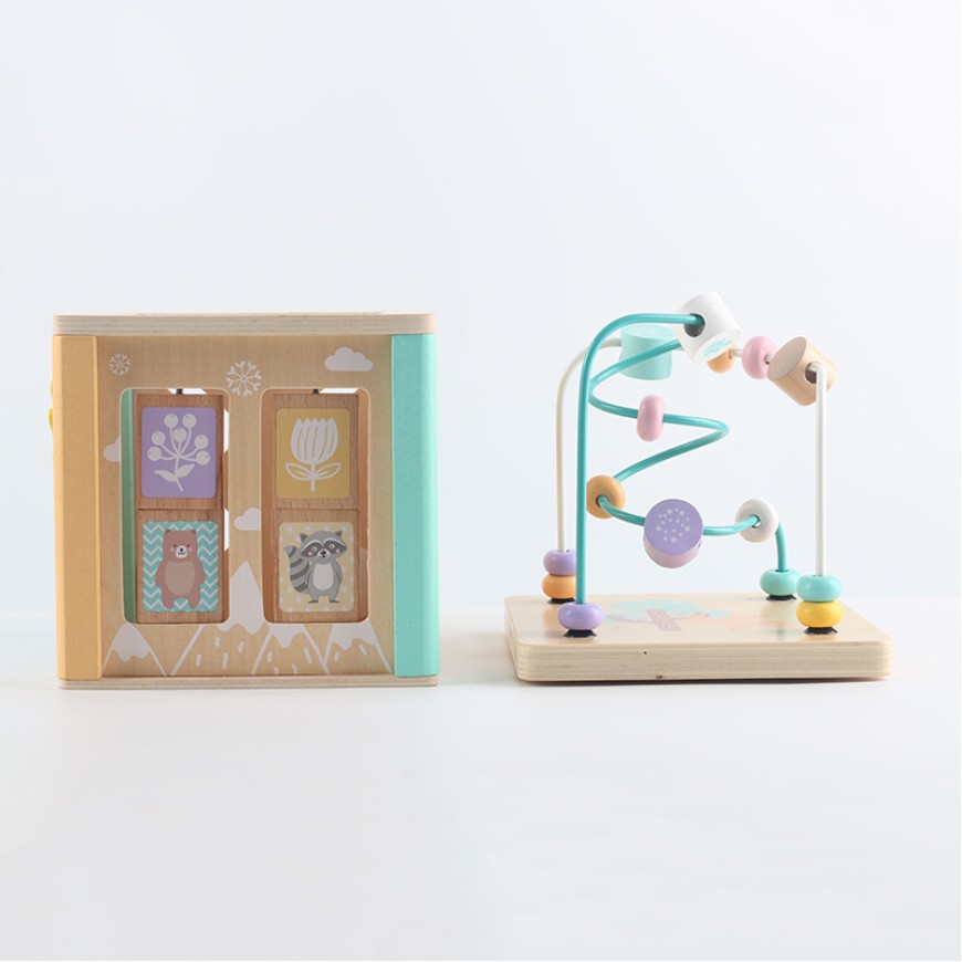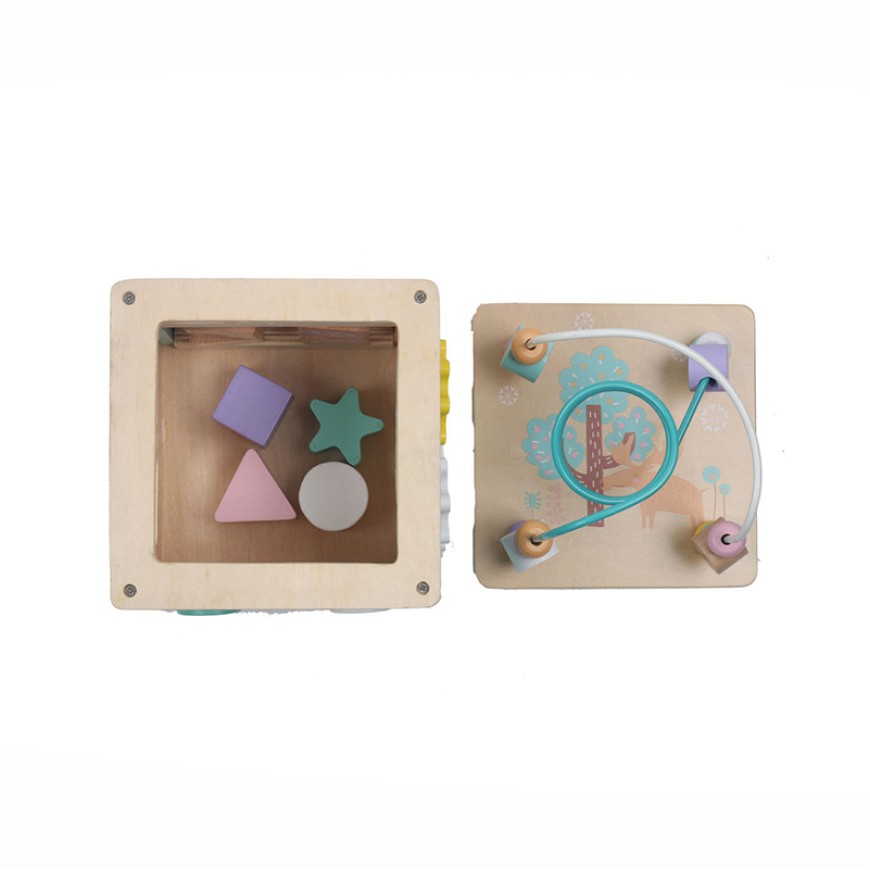 This multi-functional activity cube puzzle toy cleverly combines various classic early childhood education activities into one, integrating a wooden bead maze and shape sorting function within a single cube structure, providing children with a rich and layered play experience. The top of the cube features a colorful wooden bead maze, allowing children to push the beads along the tracks, developing hand-eye coordination and concentration. The sides feature a shape sorting area, guiding children to observe and think, correctly placing different shapes into the corresponding holes, enhancing shape recognition and spatial understanding. The toy encourages children to explore independently and try repeatedly, gradually developing logical thinking skills, problem-solving abilities, and patience through manipulation, comparison, and successful matching. The multi-sided design allows children to interact from different angles, effectively extending their attention span and reducing repetitive fatigue.
