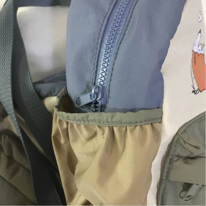 This children's backpack features a striking color-block design with vibrant, contrasting colors, full of energy and childlike charm.  The overall design is stylish and durable, suitable for everyday school use and outings. The main compartment has a smooth-operating zipper closure, making it easy for children to independently access their belongings while effectively protecting books and personal items from falling out. The backpack also features practical side pockets for storing water bottles, umbrellas, and other frequently used items, making them easily accessible. The adjustable shoulder straps allow for customization based on the child's height and build, ensuring a comfortable fit and helping to distribute weight evenly across the shoulders.